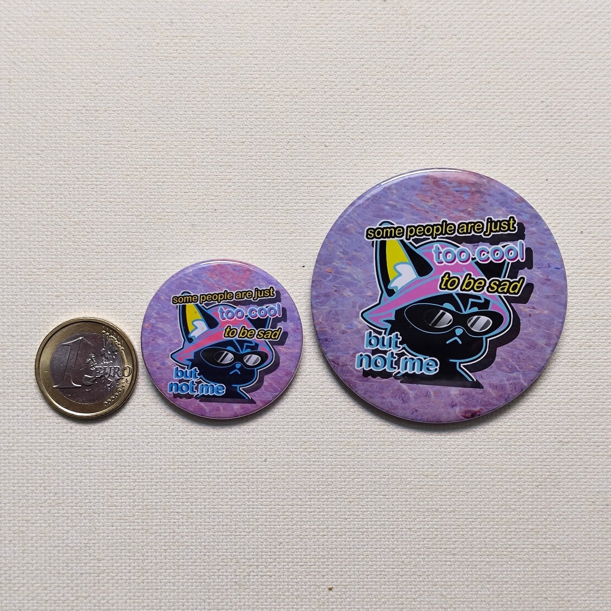 Printed on coated paper and pressed onto metal shells with a metal pin backing.